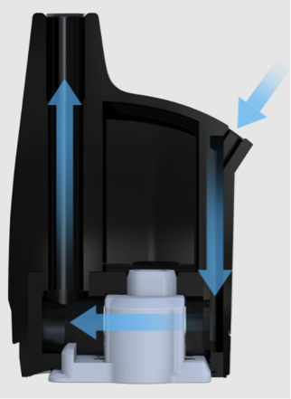 - Le clearomiseur (ou réservoir) est directement imbriqué avec la batterie par le biais d’une cartouche à remplir et d’une contenance de 8,8ml (il existe également un format de 2ml.