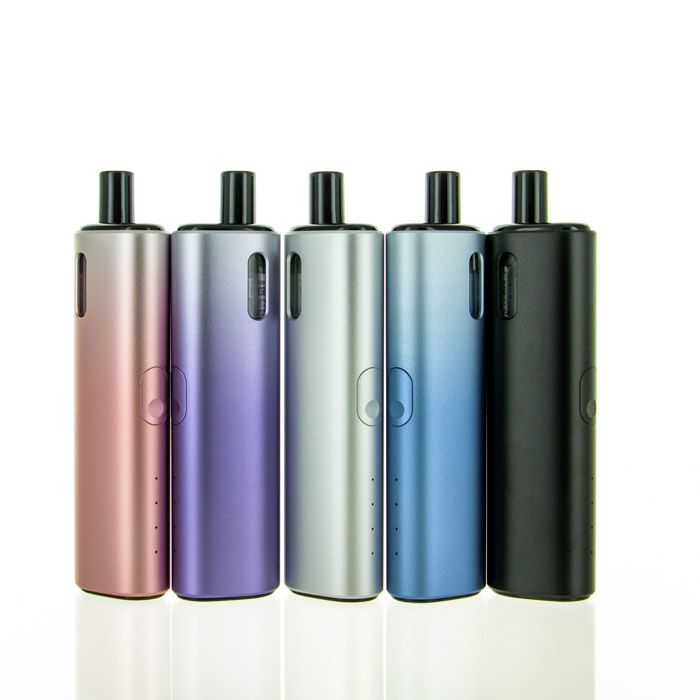 La partie réservoir est une cartouche aimantée qui se loge dans le pod par le dessus ainsi seul le drip-tip dépasse du kit complet. Une petite fenêtre permet de surveiller le niveau de liquide restant.
